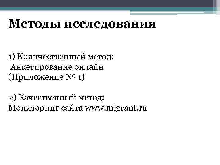 Методы исследования 1) Количественный метод: Анкетирование онлайн (Приложение № 1) 2) Качественный метод: Мониторинг сайта www. migrant. ru