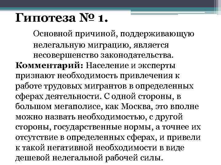 Гипотеза № 1. Основной причиной, поддерживающую нелегальную миграцию, является несовершенство законодательства. Комментарий: Население и эксперты признают необходимость привлечения к работе трудовых мигрантов в определенных сферах деятельности. С одной стороны, в большом мегаполисе, как Москва, это вполне можно назвать необходимостью, с другой стороны, государственные нормы, а точнее их отсутствие в определенных сферах, и привели к такой негативной необходимости в виде дешевой нелегальной рабочей силы.