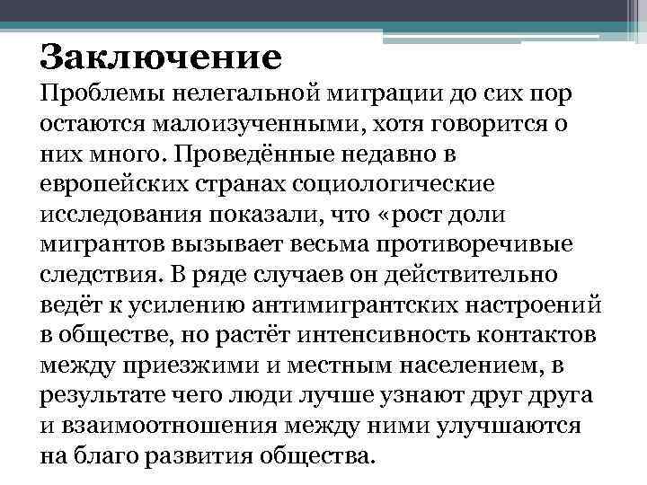 Заключение Проблемы нелегальной миграции до сих пор остаются малоизученными, хотя говорится о них много. Проведённые недавно в европейских странах социологические исследования показали, что «рост доли мигрантов вызывает весьма противоречивые следствия. В ряде случаев он действительно ведёт к усилению антимигрантских настроений в обществе, но растёт интенсивность контактов между приезжими и местным населением, в результате чего люди лучше узнают друга и взаимоотношения между ними улучшаются на благо развития общества.