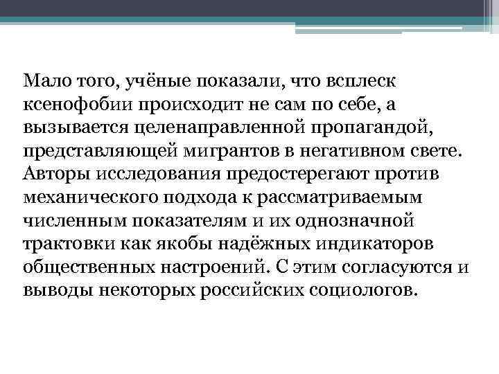Мало того, учёные показали, что всплеск ксенофобии происходит не сам по себе, а вызывается целенаправленной пропагандой, представляющей мигрантов в негативном свете. Авторы исследования предостерегают против механического подхода к рассматриваемым численным показателям и их однозначной трактовки как якобы надёжных индикаторов общественных настроений. С этим согласуются и выводы некоторых российских социологов.