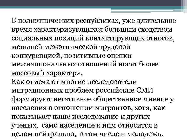 В полиэтнических республиках, уже длительное время характеризующихся большим сходством социальных позиций контактирующих этносов, меньшей межэтнической трудовой конкуренцией, позитивные оценки межнациональных отношений носят более массовый характер» . Как отмечают многие исследователи миграционных проблем российские СМИ формируют негативное общественное мнение у населения в отношении мигрантов, хотя, как показывает наше исследование и других ученых, само население к ним относится в целом нейтрально, в том числе и молодежь.
