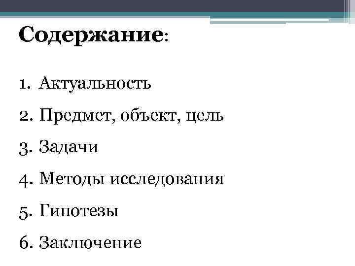 Содержание: 1. Актуальность 2. Предмет, объект, цель 3. Задачи 4. Методы исследования 5. Гипотезы 6. Заключение