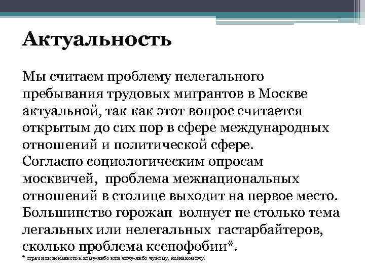 Актуальность Мы считаем проблему нелегального пребывания трудовых мигрантов в Москве актуальной, так как этот вопрос считается открытым до сих пор в сфере международных отношений и политической сфере. Согласно социологическим опросам москвичей, проблема межнациональных отношений в столице выходит на первое место. Большинство горожан волнует не столько тема легальных или нелегальных гастарбайтеров, сколько проблема ксенофобии*. * страх или ненависть к кому-либо или чему-либо чужому, незнакомому.