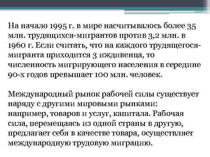 На начало 1995 г. в мире насчитывалось более 35 млн. трудящихся-мигрантов против 3, 2 млн. в 1960 г. Если считать, что на каждого трудящегосямигранта приходится 3 иждивенца, то численность мигрирующего населения в середине 90 -х годов превышает 100 млн. человек. Международный рынок рабочей силы существует наряду с другими мировыми рынками: например, товаров и услуг, капитала. Рабочая сила, перемещаясь из одной страны в другую, предлагает себя в качестве товара, осуществляет международную трудовую миграцию.