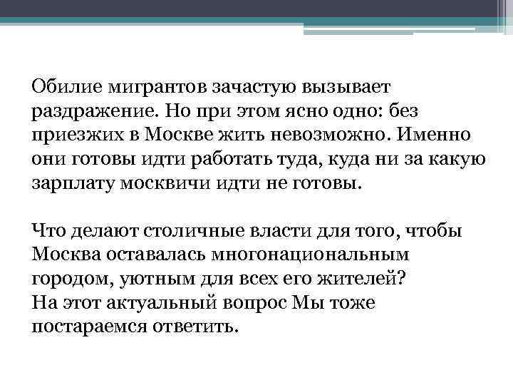 Обилие мигрантов зачастую вызывает раздражение. Но при этом ясно одно: без приезжих в Москве жить невозможно. Именно они готовы идти работать туда, куда ни за какую зарплату москвичи идти не готовы. Что делают столичные власти для того, чтобы Москва оставалась многонациональным городом, уютным для всех его жителей? На этот актуальный вопрос Мы тоже постараемся ответить.