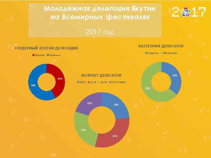 Молодежная делегация Якутии на Всемирных фестивалях 2017 год КАТЕГОРИЯ ДЕЛЕГАТОВ ГЕНДЕРНЫЙ СОСТАВ ДЕЛЕГАЦИИ Девушки 42% 58% Студенты Мужчины ВОЗРАСТ ДЕЛЕГАТОВ 18 -21 22 -25 26 -29 36% 30 И СТАРШЕ 64% 20% 24% 26% 30% Работающие