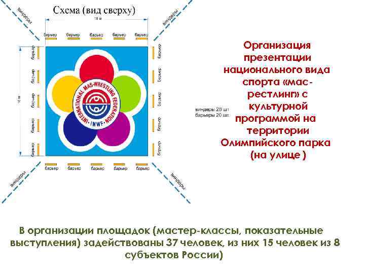 Организация презентации национального вида спорта «масрестлинг» с культурной программой на территории Олимпийского парка (на улице ) В организации площадок (мастер-классы, показательные выступления) задействованы 37 человек, из них 15 человек из 8 субъектов России)