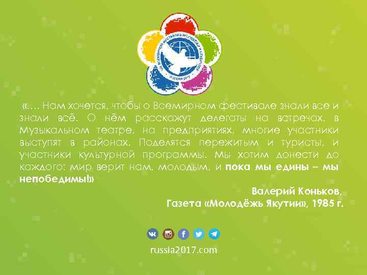 «…. Нам хочется, чтобы о Всемирном фестивале знали все и знали всё. О нём расскажут делегаты на встречах, в Музыкальном театре, на предприятиях, многие участники выступят в районах. Поделятся пережитым и туристы, и участники культурной программы. Мы хотим донести до каждого: мир верит нам, молодым, и пока мы едины – мы непобедимы!» Валерий Коньков, Газета «Молодёжь Якутии» , 1985 г. russia 2017. com