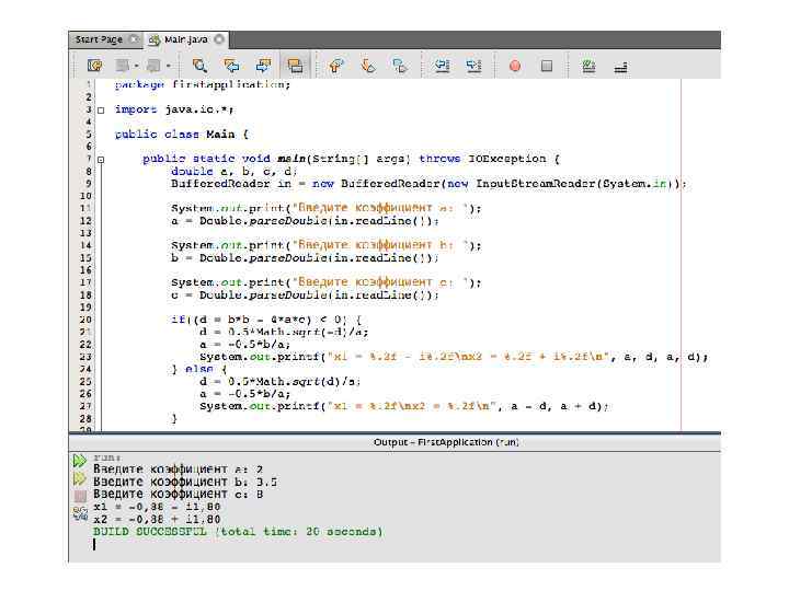 Первая программа import java. io. *; public class Main { public static void main(String[] args) throws IOException { double a, b, c, d; Buffered. Reader in = new Buffered. Reader( new Input. Stream. Reader(System. in)); System. out. print("Введите коэффициент a: "); a = Double. parse. Double(in. read. Line()); System. out. print("Введите коэффициент b: "); b = Double. parse. Double(in. read. Line()); System. out. print("Введите коэффициент c: "); c = Double. parse. Double(in. read. Line()); if ((d = b * b - 4 * a * c) < 0) { d = 0. 5 * Math. sqrt(-d) / a; a = -0. 5 * b / a; System. out. printf("x 1 = %. 2 f - i%. 2 fnx 2 = %. 2 f + "i%. 2 fn", a, d); } else { d = 0. 5 * Math. sqrt(d) / a; a = -0. 5 * b / a; System. out. printf("x 1 = %. 2 fnx 2 = %. 2 fn", a - d, a + d); } } }