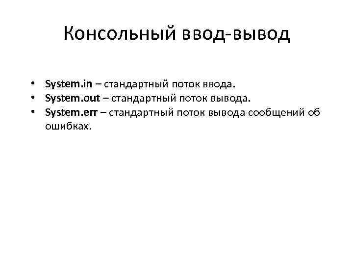 Консольный ввод-вывод • System. in – стандартный поток ввода. • System. out – стандартный поток вывода. • System. err – стандартный поток вывода сообщений об ошибках.