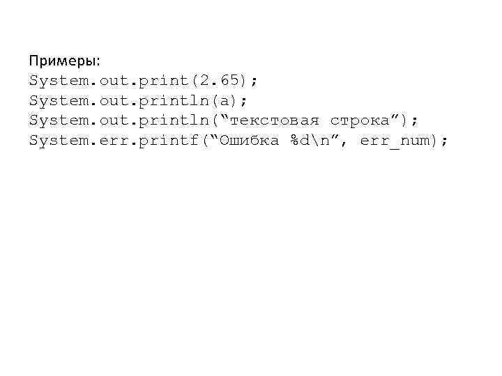 Примеры: System. out. print(2. 65); System. out. println(a); System. out. println(“текстовая строка”); System. err. printf(“Ошибка %dn”, err_num);