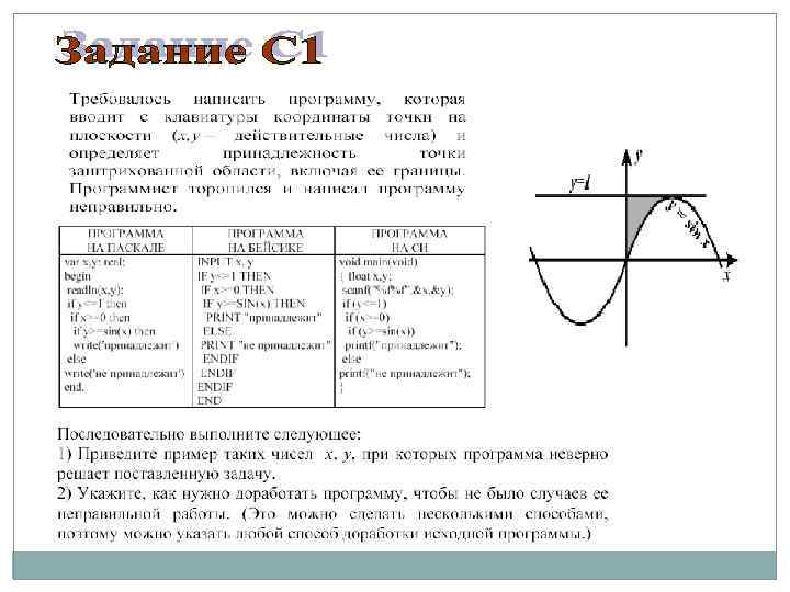 Исправленный вариант программы на языке Turbo Pascal: Program C 1; Uses crt; Var x, y: real; Begin clrscr; Writeln(‘Введите значение х и y: ’); Readln(x, y); if (x>=0)and(y<=1)and(y>=sin(x)) and (x<=pi/2 ) then writeln(‘Точка принадлежит области. ’) else writeln(‘Точка не принадлежит области. ’); Readkey; End.