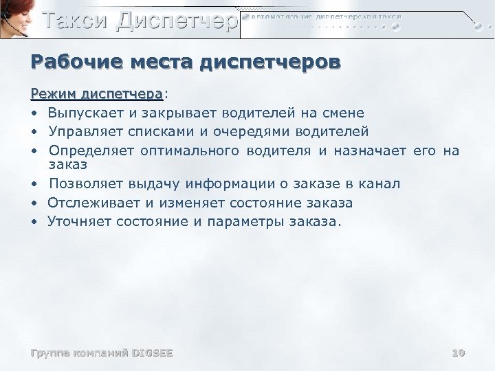 Рабочие места операторов Режим оператора: • Создает, вводит заказы такси • Определяет тип заказа, маршрут • Определяет использование дисконтных и безналичных карт • Автоматически определяет цену проезда до выполнения заказа • Учитывает простой и стоимость подачи машины • Позволяет принимать предварительные заказы и получать оповещения для их своевременного выполнения • Позволяет принимать заказы в потоке, используя оптимизированные формы и правила ввода заказа • Получает статистику по текущему состоянию системы: количество водителей на линии, количество текущих и выполненных заказов за смену • Позволяет работать с клиентом, удерживаемым на телефонной линии Группа компаний DIGSEE 9