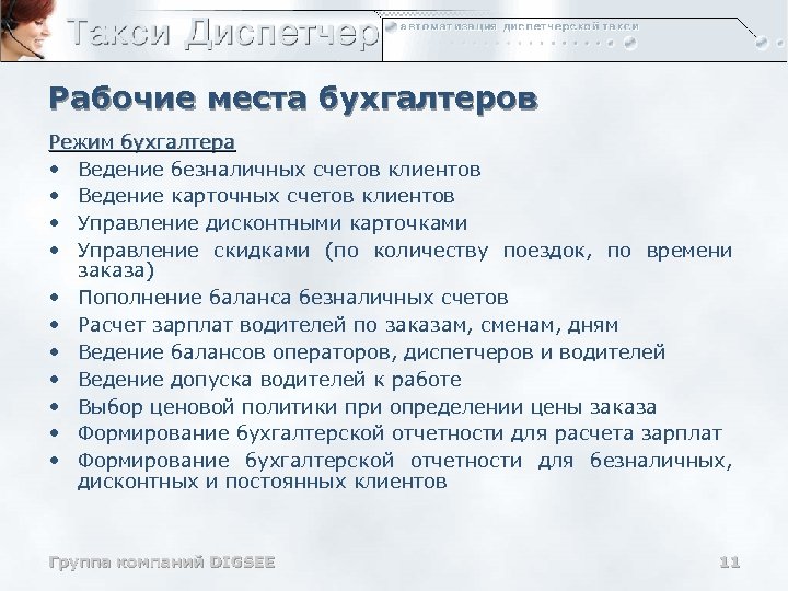 Рабочие места диспетчеров Режим диспетчера: Режим диспетчера • Выпускает и закрывает водителей на смене • Управляет списками и очередями водителей • Определяет оптимального водителя и назначает его на заказ • Позволяет выдачу информации о заказе в канал • Отслеживает и изменяет состояние заказа • Уточняет состояние и параметры заказа. Группа компаний DIGSEE 10