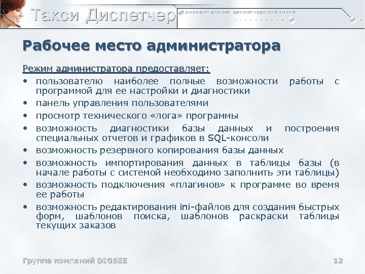 Рабочие места бухгалтеров Режим бухгалтера • Ведение безналичных счетов клиентов • Ведение карточных счетов клиентов • Управление дисконтными карточками • Управление скидками (по количеству поездок, по времени заказа) • Пополнение баланса безналичных счетов • Расчет зарплат водителей по заказам, сменам, дням • Ведение балансов операторов, диспетчеров и водителей • Ведение допуска водителей к работе • Выбор ценовой политики при определении цены заказа • Формирование бухгалтерской отчетности для расчета зарплат • Формирование бухгалтерской отчетности для безналичных, дисконтных и постоянных клиентов Группа компаний DIGSEE 11