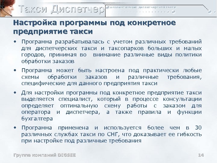 Отчетность, расчеты зарплат, статистика Возможности программы: • Программа имеет более 40 различных отчетов • Статистические отчеты • Маркетинговые отчеты • Аналитические отчеты • Бухгалтерские отчеты • Отчеты построены на расширяемой системе «плагинов» (возможна доработка сторонними программистами) • Программа предоставляет правила расчета заработной платы для операторов, диспетчеров и водителей Группа компаний DIGSEE 13