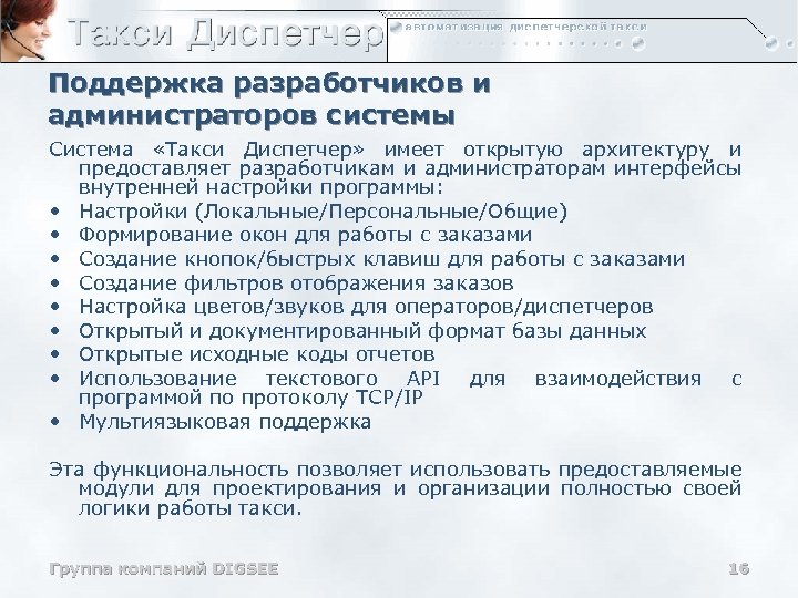 Поддержка разработчиков и администраторов системы Система «Такси Диспетчер» имеет открытую архитектуру и предоставляет разработчикам и администраторам интерфейсы внутренней настройки программы: • Настройки (Локальные/Персональные/Общие) • Формирование окон для работы с заказами • Создание кнопок/быстрых клавиш для работы с заказами • Создание фильтров отображения заказов • Настройка цветов/звуков для операторов/диспетчеров • Открытый и документированный формат базы данных • Открытые исходные коды отчетов • Использование текстового API для взаимодействия с программой по протоколу TCP/IP • Мультиязыковая поддержка Эта функциональность позволяет использовать предоставляемые модули для проектирования и организации полностью своей логики работы такси. Группа компаний DIGSEE 16