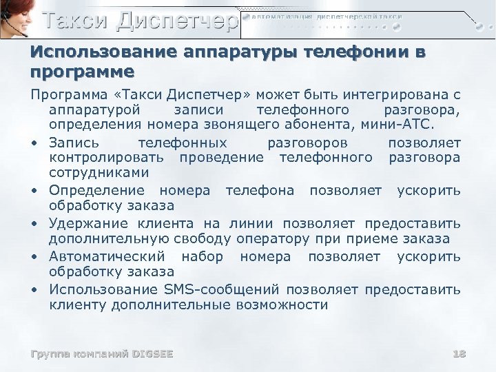 Использование аппаратуры телефонии в программе Программа «Такси Диспетчер» может быть интегрирована с аппаратурой записи телефонного разговора, определения номера звонящего абонента, мини-АТС. • Запись телефонных разговоров позволяет контролировать проведение телефонного разговора сотрудниками • Определение номера телефона позволяет ускорить обработку заказа • Удержание клиента на линии позволяет предоставить дополнительную свободу оператору приеме заказа • Автоматический набор номера позволяет ускорить обработку заказа • Использование SMS-сообщений позволяет предоставить клиенту дополнительные возможности Группа компаний DIGSEE 18