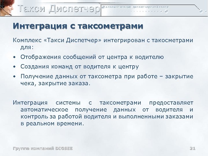 Интеграция с таксометрами Комплекс «Такси Диспетчер» интегрирован с такосметрами для: • Отображения сообщений от центра к водителю • Создания команд от водителя к центру • Получение данных от таксометра при работе – закрытие чека, закрытие заказа. Интеграция системы с таксометрами предоставляет автоматическое получение данных от водителя и контроль за работой водителя и выполненными заказами в реальном времени. Группа компаний DIGSEE 21