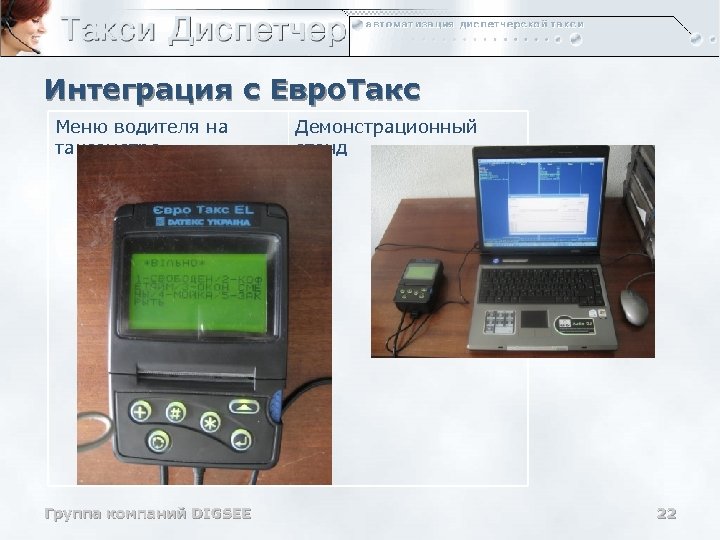Интеграция с Евро. Такс Меню водителя на таксометре Группа компаний DIGSEE Демонстрационный стенд 22