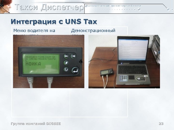 Интеграция с UNS Tax Меню водителя на таксометре Группа компаний DIGSEE Демонстрационный стенд 23