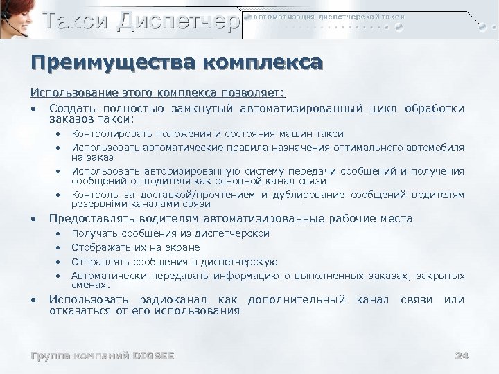 Преимущества комплекса Использование этого комплекса позволяет: • Создать полностью замкнутый автоматизированный цикл обработки заказов такси: • • • Предоставлять водителям автоматизированные рабочие места • • • Контролировать положения и состояния машин такси Использовать автоматические правила назначения оптимального автомобиля на заказ Использовать авторизированную систему передачи сообщений и получения сообщений от водителя как основной канал связи Контроль за доставкой/прочтением и дублирование сообщений водителям резервніми каналами связи Получать сообщения из диспетчерской Отображать их на экране Отправлять сообщения в диспетчерскую Автоматически передавать информацию о выполненных заказах, закрытых сменах. Использовать радиоканал как дополнительный канал связи или отказаться от его использования Группа компаний DIGSEE 24