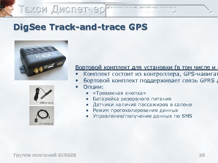 Dig. See Track-and-trace GPS Бортовой комплект для установки (в том числе и с • Комплект состоит из контроллера, GPS-навигат • Бортовой комплект поддерживает связь GPRS д • Опции: • • • Группа компаний DIGSEE «Тревожная кнопка» Батарейка резервного питания Датчики наличия пассажиров в салоне Режим протоколирования данных Управление/получение данных по SMS 25