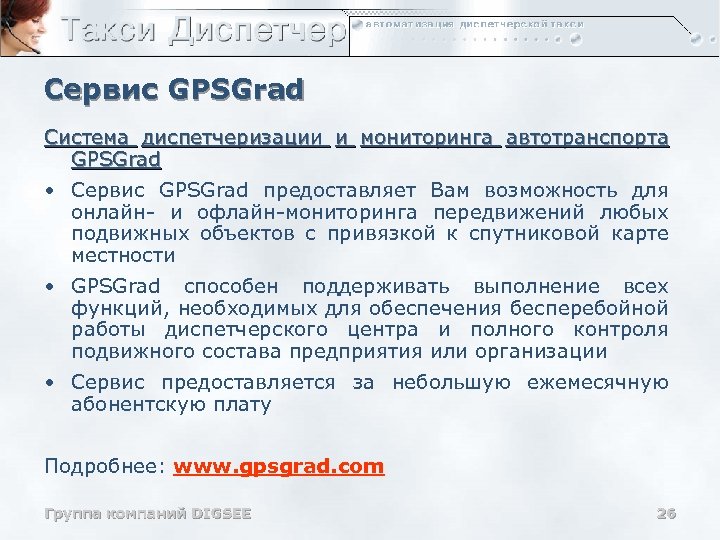 Сервис GPSGrad Система диспетчеризации и мониторинга автотранспорта GPSGrad • Сервис GPSGrad предоставляет Вам возможность для онлайн- и офлайн-мониторинга передвижений любых подвижных объектов с привязкой к спутниковой карте местности • GPSGrad способен поддерживать выполнение всех функций, необходимых для обеспечения бесперебойной работы диспетчерского центра и полного контроля подвижного состава предприятия или организации • Сервис предоставляется за небольшую ежемесячную абонентскую плату Подробнее: www. gpsgrad. com Группа компаний DIGSEE 26