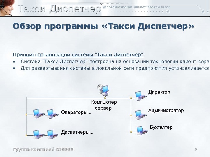 Обзор программы «Такси Диспетчер» Принцип организации системы "Такси Диспетчер" • Система "Такси Диспетчер" построена на основании технологии клиент-серве • Для развертывания системы в локальной сети предприятия устанавливается Группа компаний DIGSEE 7