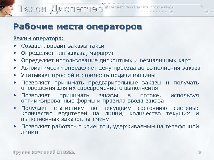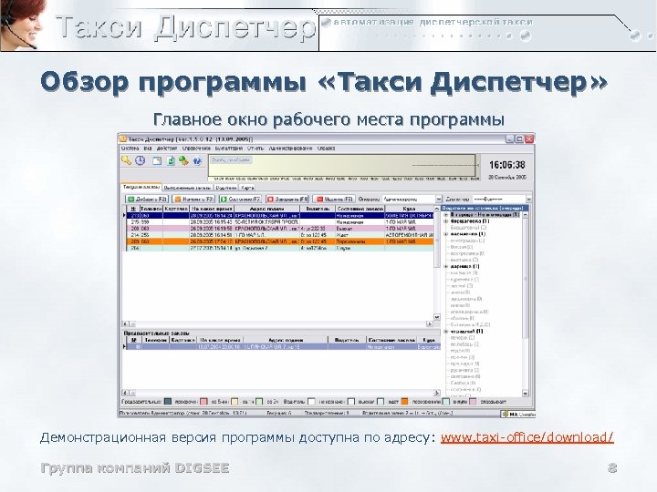 Обзор программы «Такси Диспетчер» Главное окно рабочего места программы Демонстрационная версия программы доступна по адресу: www. taxi-office/download/ Группа компаний DIGSEE 8