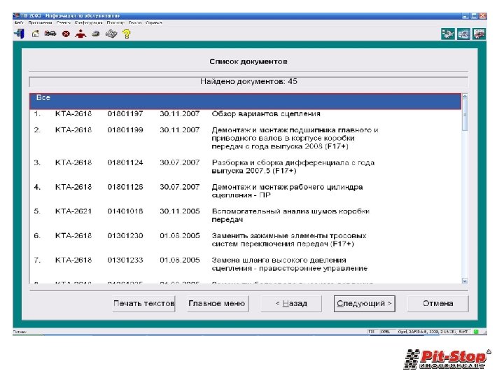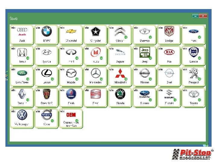 Список автомобилей • AUDI (1992 -2014 г. в. ), перечень моделей по «Elsa Win» • BMW (1990 -2015 г. в. ), перечень моделей по «TIS» , «WDS» • CHEVROLET (1995 -2012 г. в. ), перечень моделей по «Chevrolet TIS» • CHRYSLER 300 М (1998 -2004 г. в. ), 300 С (2004 -2010 г. в. ), New Yorker (1994 -1997 г. в. ), PACIFICA (20032008 г. в. ), PT CRUISER (2001 -2009 г. в. ), TOWN & COUNTRY (1995 -2010 г. в. ), Voyager (1998 -2010 г. в. ), перечень моделей по «CHRYSLER Manuals» • CITROEN (1990 -2014 г. в. ), перечень моделей по «Citroen Service Box» , «Citroen SEDRE» • DAEWOO (1997 -2010 г. в. ), перечень моделей по «Daewoo TIS» , «Daewoo Manuals» • DODGE CARAVAN (1995 -2010 г. в. ), DURANGO (1998 -2010 г. в. ), Neon (1995 -2003 г. в. ), Stratus (1994 -2001 г. в. ), перечень моделей по « DODGE Manuals» • Ford (1986 -2004 г. в. ), перечень моделей по «TIS» • Ford (1995 -2010 г. в. ), перечень моделей по «ETIS» • Jaguar (1994 -2005 г. в. ), перечень моделей по «TIS» • JEEP Cherokee (1991 -2008 г. в. ) Grand Cherokee (1993 -2005 г. в. ) Wrangler (1997 -2007 г. в. ), перечень моделей по «JEEP Manuals» • HONDA Accord (1989 -2011 г. в. ), Accord Aerodeck (1993 -1998 г. в. ), Civic (1991 -2009 г. в. ), Concerto (19901995 г. в. ), CR-V (1997 -2009 г. в. ), FR-V (2004 -2009 г. в. ), HR-V (1999 -2006 г. в. ), Jazz (2001 -2011 г. в. ), Legend (1986 -1996 г. в. ), NSX (1991 -1997 г. в. ), Prelude (1992 -2001 г. в. ), S 2000 (1999 -2010 г. в. ), Stream (2001 -2006 г. в. ), перечень моделей по «HONDA Manuals» • HYUNDAI (1999 -2015 г. в. ), перечень моделей по «GDS» • ISUZU Rodeo (1999 -2006 г. в. ), Rodeo Sport (1999 -2006 г. в. ), Trooper (1999 -2006 г. в. ), Vechicross (19992006 г. в. ), перечень моделей по «ISUZU Manuals»