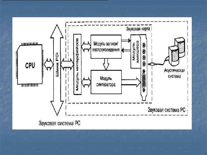 n n Звуковая система PC выполняется в виде самостоятельных звуковых карт, устанавливаемых в слот материнской платы, либо может быть интегрирована на материнскую плату или карту расширения другой подсистемы PC. Отдельные функциональные модули звуковой системы могут выполняться в виде дочерних плат, устанавливаемых в соответствующие разъемы звуковой карты. Дочерняя плата обычно расширяет базовые возможности звуковой системы. В классическую звуковую систему входят: n n n Модуль записи и воспроизведения звука Модуль синтезатора Модуль интерфейсов Модуль микшера Акустическая система