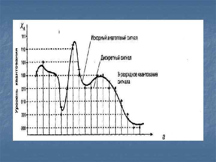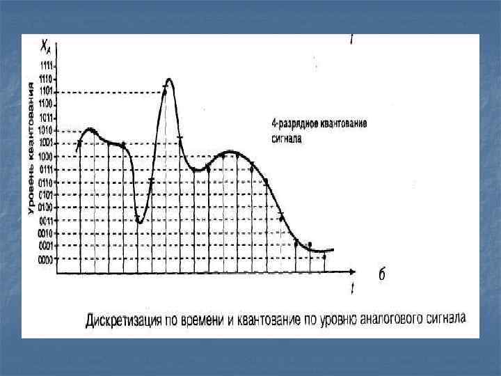 Квантование по уровню – сопоставление каждому значению сигнала цифрового кода – оцифровка. Зависит от разрядности шины передачи данных. Если шина имеет N разрядов, то количество уровней равно 2 в степени N. Разрядность постоянно растет: 1981 г. IBM PC/XT – 8 разрядов n 2007 г. – 64 разряда n