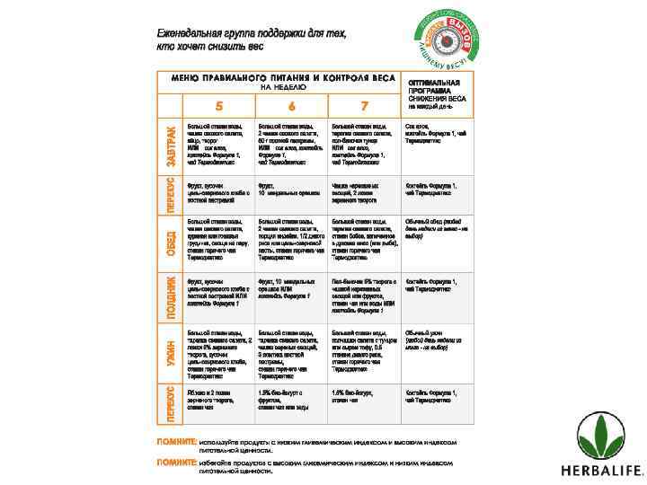 Как превратить правильный завтрак в программу снижения веса? Шаг 1: Объяснить, что правильный завтрак – это не программа снижения веса (даже невзирая на фактическое его снижение) Шаг 2: Научить пользоваться таблицей гликемических индексов Шаг 3: Вручить Меню правильного питания на неделю Шаг 4: Объяснить принципы обмена веществ и необходимость принимать пищу каждые три часа (5 -6 небольших трапез в день) Шаг 5: Порекомендовать заменить несколько из них на коктейли Шаг 6: Порекомендовать выпивать 1. 5 л чая Термоджетикс в течение дня