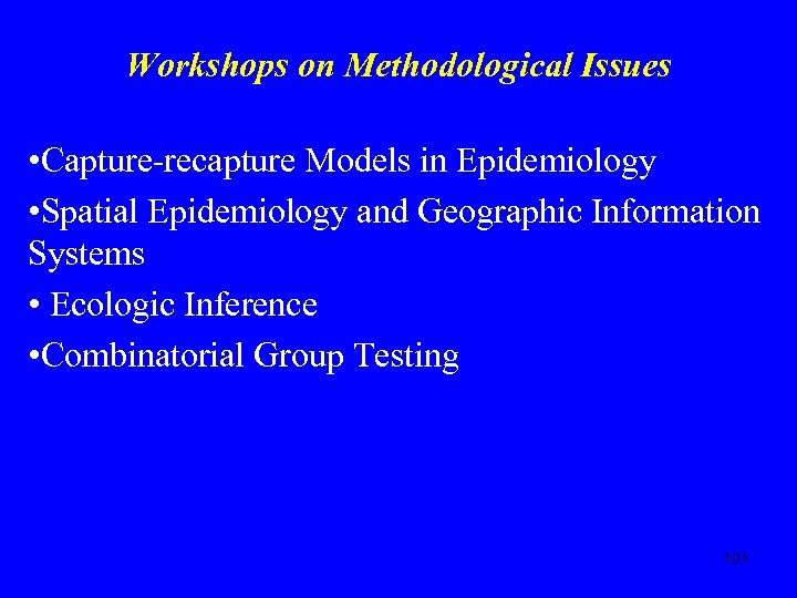Workshops on Methodological Issues • Capture-recapture Models in Epidemiology • Spatial Epidemiology and Geographic Information Systems • Ecologic Inference • Combinatorial Group Testing 101