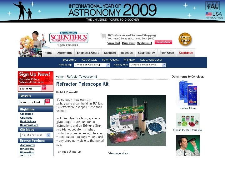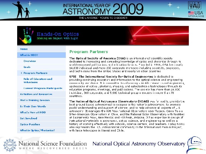 Parallel, Collaborative Efforts IAU Telescope Kit Task Group • Chair: Rick Fienberg, S&T • Focus: Public outreach AAS Telescope Kits & Optics Challenge Working Group • Chair: Steve Pompea, NOAO • Focus: Informal and formal science education