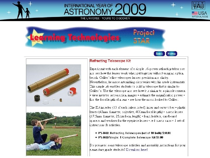 From the IAU IYA 2009 Public Brochure: The Galileoscope A simple, accessible, and easy-touse telescope that can be distributed by the millions. Ideally, every participant in an IYA 2009 event should be able to take home one of these little telescopes.