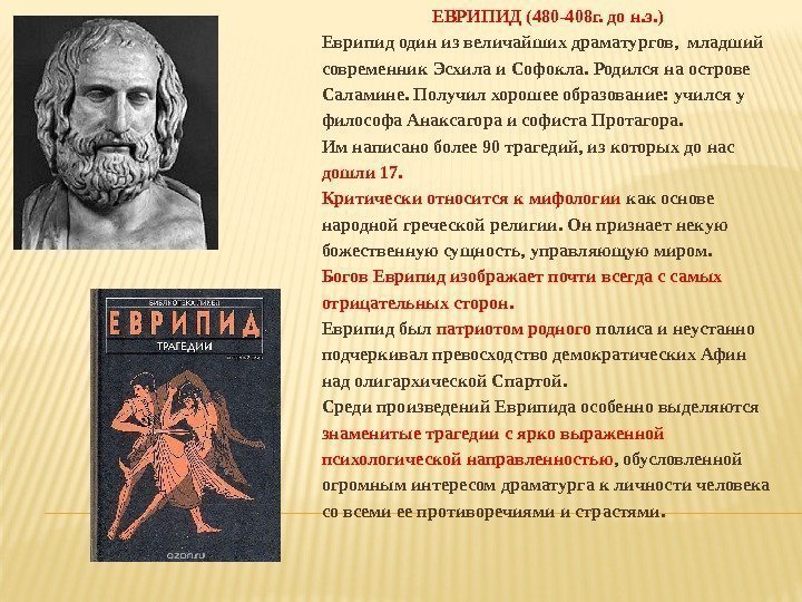 ЕВРИПИД (480 -408 г. до н. э. ) Еврипид один из величайших драматургов, младший современник Эсхила и Софокла. Родился на острове Саламине. Получил хорошее образование: учился у философа Анаксагора и софиста Протагора. Им написано более 90 трагедий, из которых до нас дошли 17. Критически относится к мифологии как основе народной греческой религии. Он признает некую божественную сущность, управляющую миром. Богов Еврипид изображает почти всегда с самых отрицательных сторон. Еврипид был патриотом родного полиса и неустанно подчеркивал превосходство демократических Афин над олигархической Спартой. Среди произведений Еврипида особенно выделяются знаменитые трагедии с ярко выраженной психологической направленностью , обусловленной огромным интересом драматурга к личности человека со всеми ее противоречиями и страстями.