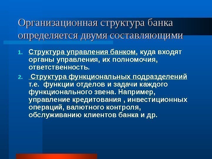 Организационная структура банка определяется двумя составляющими 1. Структура управления банком , куда входят органы управления, их полномочия, ответственность. 2. Структура функциональных подразделений т. е. функции отделов и задачи каждого функционального звена. Например, управление кредитования , инвестиционных операций, валютного контроля, обслуживанию клиентов банка и др.