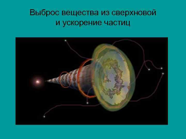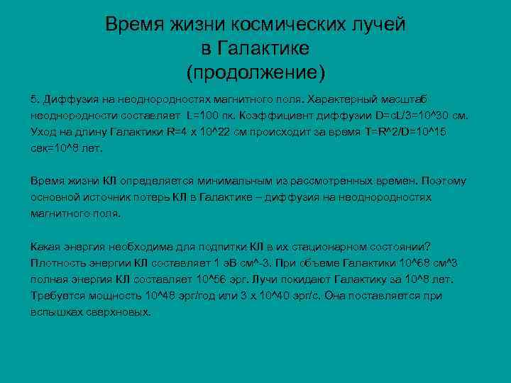 Время жизни космических лучей в Галактике (продолжение) 5. Диффузия на неоднородностях магнитного поля. Характерный масштаб неоднородности составляет L=100 пк. Коэффициент диффузии D=c. L/3=10^30 см. Уход на длину Галактики R=4 х 10^22 см происходит за время T=R^2/D=10^15 сек=10^8 лет. Время жизни КЛ определяется минимальным из рассмотренных времен. Поэтому основной источник потерь КЛ в Галактике – диффузия на неоднородностях магнитного поля. Какая энергия необходима для подпитки КЛ в их стационарном состоянии? Плотность энергии КЛ составляет 1 э. В см^-3. При объеме Галактики 10^68 см^3 полная энергия КЛ составляет 10^56 эрг. Лучи покидают Галактику за 10^8 лет. Требуется мощность 10^48 эрг/год или 3 х 10^40 эрг/с. Она поставляется при вспышках сверхновых.