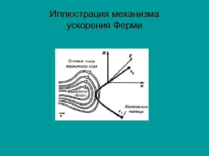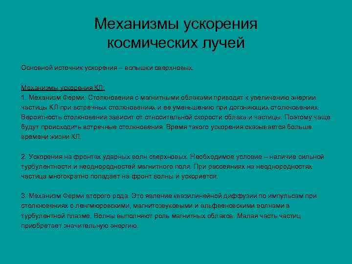 Механизмы ускорения космических лучей Основной источник ускорения – вспышки сверхновых. Механизмы ускорения КЛ: 1. Механизм Ферми. Столкновения с магнитными облаками приводят к увеличению энергии частицы КЛ при встречных столкновениях и ее уменьшению при догоняющих столкновениях. Вероятность столкновения зависит от относительной скорости облака и частицы. Поэтому чаще будут происходить встречные столкновения. Время такого ускорения оказывается больше времени жизни КЛ. 2. Ускорения на фронтах ударных волн сверхновых. Необходимое условие – наличие сильной турбулентности и неоднородностей магнитного поля. При рассеяниях на неоднородностях частица многократно попадает на фронт волны и ускоряется. 3. Механизм Ферми второго рода. Это явление квазилинейной диффузии по импульсам при столкновениях с ленгмюровскими, магнитозвуковыми и альфвеновскими волнами в турбулентной плазме. Волны выполняют роль магнитных облаков. Малая часть частиц приобретает значительную энергию.