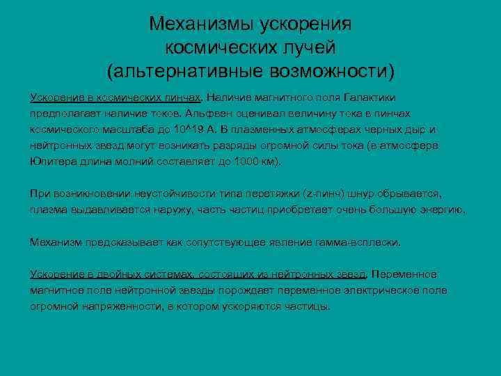 Механизмы ускорения космических лучей (альтернативные возможности) Ускорение в космических пинчах. Наличие магнитного поля Галактики предполагает наличие токов. Альфвен оценивал величину тока в пинчах космического масштаба до 10^19 А. В плазменных атмосферах черных дыр и нейтронных звезд могут возникать разряды огромной силы тока (в атмосфере Юпитера длина молний составляет до 1000 км). При возникновении неустойчивости типа перетяжки (z-пинч) шнур обрывается, плазма выдавливается наружу, часть частиц приобретает очень большую энергию. Механизм предсказывает как сопутствующее явление гамма-всплески. Ускорение в двойных системах, состоящих из нейтронных звезд. Переменное магнитное поле нейтронной звезды порождает переменное электрическое поле огромной напряженности, в котором ускоряются частицы.