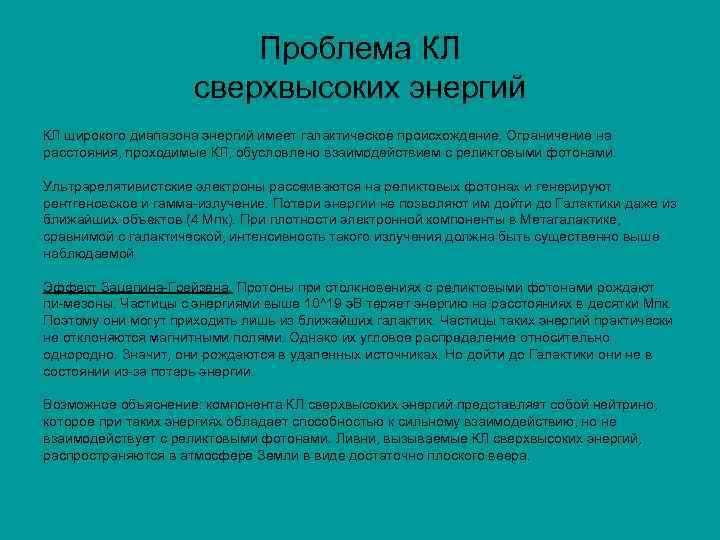 Проблема КЛ сверхвысоких энергий КЛ широкого диапазона энергий имеет галактическое происхождение. Ограничение на расстояния, проходимые КЛ, обусловлено взаимодействием с реликтовыми фотонами. Ультрарелятивистские электроны рассеиваются на реликтовых фотонах и генерируют рентгеновское и гамма-излучение. Потери энергии не позволяют им дойти до Галактики даже из ближайших объектов (4 Мпк). При плотности электронной компоненты в Метагалактике, сравнимой с галактической, интенсивность такого излучения должна быть существенно выше наблюдаемой Эффект Зацепина-Грейзена. Протоны при столкновениях с реликтовыми фотонами рождают пи-мезоны. Частицы с энергиями выше 10^19 э. В теряет энергию на расстояниях в десятки Мпк. Поэтому они могут приходить лишь из ближайших галактик. Частицы таких энергий практически не отклоняются магнитными полями. Однако их угловое распределение относительно однородно. Значит, они рождаются в удаленных источниках. Но дойти до Галактики они не в состоянии из-за потерь энергии. Возможное объяснение: компонента КЛ сверхвысоких энергий представляет собой нейтрино, которое при таких энергиях обладает способностью к сильному взаимодействию, но не взаимодействует с реликтовыми фотонами. Ливни, вызываемые КЛ сверхвысоких энергий, распространяются в атмосфере Земли в виде достаточно плоского веера.