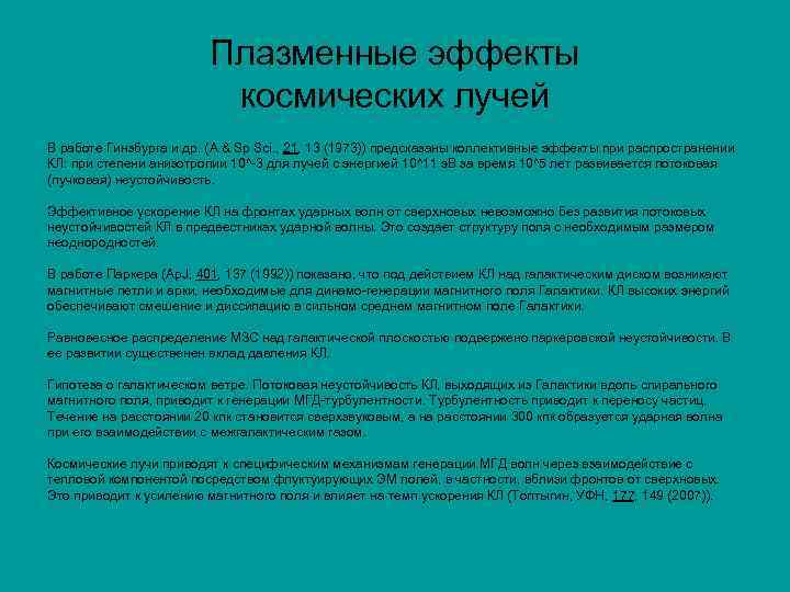 Плазменные эффекты космических лучей В работе Гинзбурга и др. (A & Sp Sci. , 21, 13 (1973)) предсказаны коллективные эффекты при распространении КЛ: при степени анизотропии 10^-3 для лучей с энергией 10^11 э. В за время 10^5 лет развивается потоковая (пучковая) неустойчивость. Эффективное ускорение КЛ на фронтах ударных волн от сверхновых невозможно без развития потоковых неустойчивостей КЛ в предвестниках ударной волны. Это создает структуру поля с необходимым размером неоднородностей. В работе Паркера (Ap. J, 401, 137 (1992)) показано, что под действием КЛ над галактическим диском возникают магнитные петли и арки, необходимые для динамо-генерации магнитного поля Галактики. КЛ высоких энергий обеспечивают смешение и диссипацию в сильном среднем магнитном поле Галактики. Равновесное распределение МЗС над галактической плоскостью подвержено паркеровской неустойчивости. В ее развитии существенен вклад давления КЛ. Гипотеза о галактическом ветре. Потоковая неустойчивость КЛ, выходящих из Галактики вдоль спирального магнитного поля, приводит к генерации МГД-турбулентности. Турбулентность приводит к переносу частиц. Течение на расстоянии 20 кпк становится сверхзвуковым, а на расстоянии 300 кпк образуется ударная волна при его взаимодействии с межгалактическим газом. Космические лучи приводят к специфическим механизмам генерации МГД волн через взаимодействие с тепловой компонентой посредством флуктуирующих ЭМ полей, в частности, вблизи фронтов от сверхновых. Это приводит к усилению магнитного поля и влияет на темп ускорения КЛ (Топтыгин, УФН, 177, 149 (2007)).