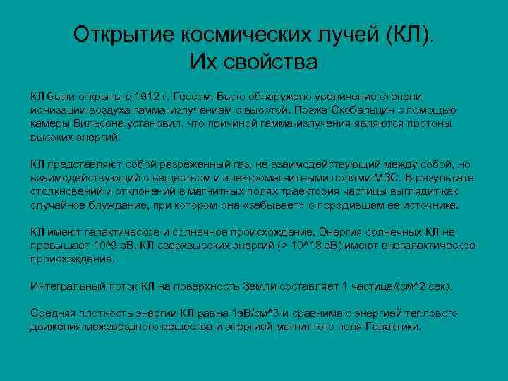 Открытие космических лучей (КЛ). Их свойства КЛ были открыты в 1912 г. Гессом. Было обнаружено увеличение степени ионизации воздуха гамма-излучением с высотой. Позже Скобельцин с помощью камеры Вильсона установил, что причиной гамма-излучения являются протоны высоких энергий. КЛ представляют собой разреженный газ, не взаимодействующий между собой, но взаимодействующий с веществом и электромагнитными полями МЗС. В результате столкновений и отклонений в магнитных полях траектория частицы выглядит как случайное блуждание, при котором она «забывает» о породившем ее источнике. КЛ имеют галактическое и солнечное происхождение. Энергия солнечных КЛ не превышает 10^9 э. В. КЛ сверхвысоких энергий (> 10^18 э. В) имеют внегалактическое происхождение. Интегральный поток КЛ на поверхность Земли составляет 1 частица/(см^2 сек). Средняя плотность энергии КЛ равна 1 э. В/см^3 и сравнима с энергией теплового движения межзвездного вещества и энергией магнитного поля Галактики.
