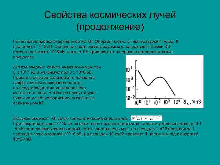 Свойства космических лучей (продолжение) Нетепловое происхождение энергии КЛ. Энергия частиц с температурой 1 млрд. К составляет 10^5 э. В. Основная часть регистрируемых у поверхности Земли КЛ имеет энергию от 10^8 э. В и выше. КЛ приобретают энергию в астрофизических процессах. Низкие энергии: спектр имеет минимум при 3 х 10^7 э. В и максимум при 3 х 10^8 э. В. Провал в спектре связывают с наиболее эффективным рассеянием частиц на неоднородностях межпланетного магнитного поля. В спектре присутствуют сильные и частые вариации, вызванные солнечными КЛ. Высокие энергии: КЛ имеют энергетический спектр вида При энергиях, выше 10^15 э. В, спектр терпит излом, показатель степени увеличивается до 3. 1. В области сверхвысоких энергий поток частиц очень мал: на площадь 1 м^2 приходится 1 частица в год с энергией 10^16 э. В; на площадь 10 км^2 попадает 1 частица в год с энергией 10^20 э. В.