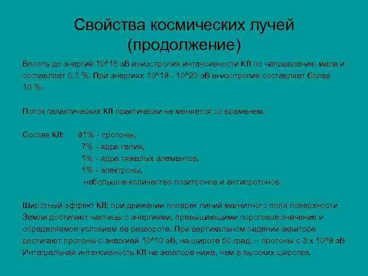 Свойства космических лучей (продолжение) Вплоть до энергий 10^15 э. В анизотропия интенсивности КЛ по направлению мала и составляет 0. 1 %. При энергиях 10^19 - 10^20 э. В анизотропия составляет более 10 %. Поток галактических КЛ практически не меняется со временем. Состав КЛ: 91% - протоны, 7% - ядра гелия, 1% - ядра тяжелых элементов, 1% - электроны, небольшое количество позитронов и антипротонов. Широтный эффект КЛ: при движении поперек линий магнитного поля поверхности Земли достигают частицы с энергиями, превышающими пороговое значение и определяемое условием ее разворота. При вертикальном падении экватора достигают протоны с энергией 10^10 э. В, на широте 50 град. – протоны с 3 х 10^9 э. В Интегральная интенсивность КЛ на экваторе ниже, чем в высоких широтах.
