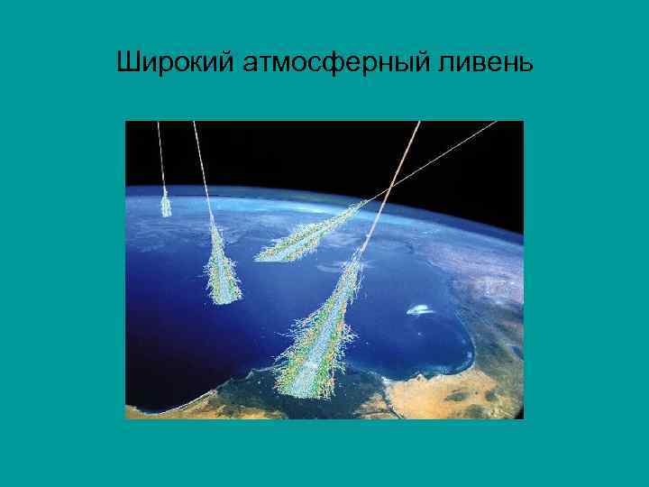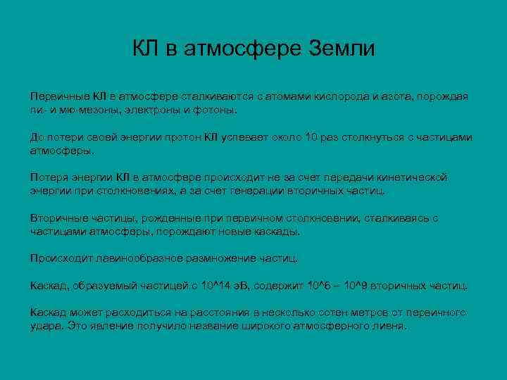 КЛ в атмосфере Земли Первичные КЛ в атмосфере сталкиваются с атомами кислорода и азота, порождая пи- и мю-мезоны, электроны и фотоны. До потери своей энергии протон КЛ успевает около 10 раз столкнуться с частицами атмосферы. Потеря энергии КЛ в атмосфере происходит не за счет передачи кинетической энергии при столкновениях, а за счет генерации вторичных частиц. Вторичные частицы, рожденные при первичном столкновении, сталкиваясь с частицами атмосферы, порождают новые каскады. Происходит лавинообразное размножение частиц. Каскад, образуемый частицей с 10^14 э. В, содержит 10^6 – 10^9 вторичных частиц. Каскад может расходиться на расстояния в несколько сотен метров от первичного удара. Это явление получило название широкого атмосферного ливня.