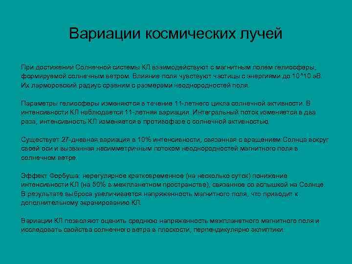 Вариации космических лучей При достижении Солнечной системы КЛ взаимодействуют с магнитным полем гелиосферы, формируемой солнечным ветром. Влияние поля чувствуют частицы с энергиями до 10^10 э. В. Их ларморовский радиус сравним с размерами неоднородностей поля. Параметры гелиосферы изменяются в течение 11 -летнего цикла солнечной активности. В интенсивности КЛ наблюдается 11 -летняя вариация. Интегральный поток изменяется в два раза, интенсивность КЛ изменяется в противофазе с солнечной активностью. Существует 27 -дневная вариация в 10% интенсивности, связанная с вращением Солнца вокруг своей оси и вызванная несимметричным потоком неоднородностей магнитного поля в солнечном ветре. Эффект Форбуша: нерегулярное кратковременное (на несколько суток) понижение интенсивности КЛ (на 50% в межпланетном пространстве), связанное со вспышкой на Солнце. В результате выброса увеличивается напряженность магнитного поля, что приводит к дополнительному экранированию КЛ. Вариации КЛ позволяют оценить среднюю напряженность межпланетного магнитного поля и исследовать свойства солнечного ветра в плоскости, перпендикулярно эклиптики.