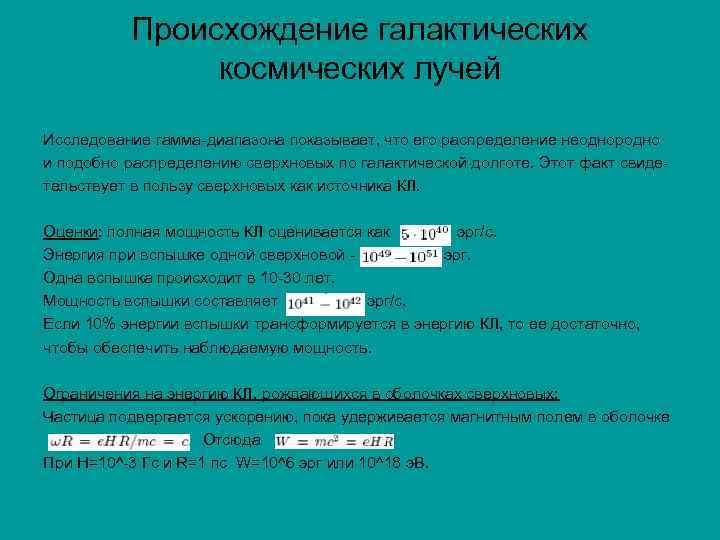 Происхождение галактических космических лучей Исследование гамма-диапазона показывает, что его распределение неоднородно и подобно распределению сверхновых по галактической долготе. Этот факт свидетельствует в пользу сверхновых как источника КЛ. Оценки: полная мощность КЛ оценивается как эрг/с. Энергия при вспышке одной сверхновой эрг. Одна вспышка происходит в 10 -30 лет. Мощность вспышки составляет эрг/с. Если 10% энергии вспышки трансформируется в энергию КЛ, то ее достаточно, чтобы обеспечить наблюдаемую мощность. Ограничения на энергию КЛ, рождающихся в оболочках сверхновых: Частица подвергается ускорению, пока удерживается магнитным полем в оболочке Отсюда При H=10^-3 Гс и R=1 пс W=10^6 эрг или 10^18 э. В.